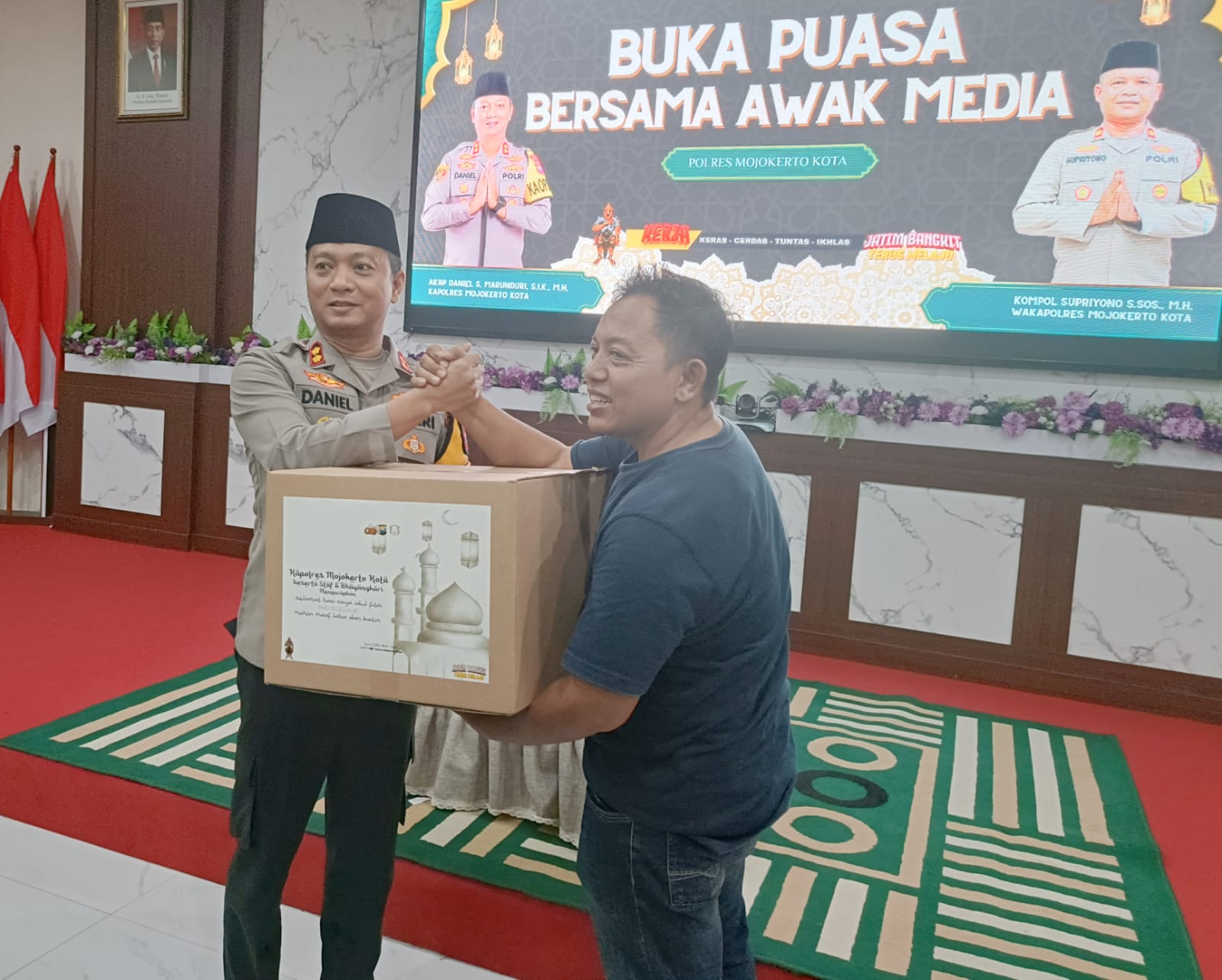 Dalam kesempatan itu, untuk berbagi kebahagian di bulan ramadhan kepada para awak media di Mojokerto Raya. Kapolres Mojokerto kota membagikan bingkisan kepada awak media, penyerahan simbolis diberikan kepada ketua PWI Mojokerto Raya.(Kar)