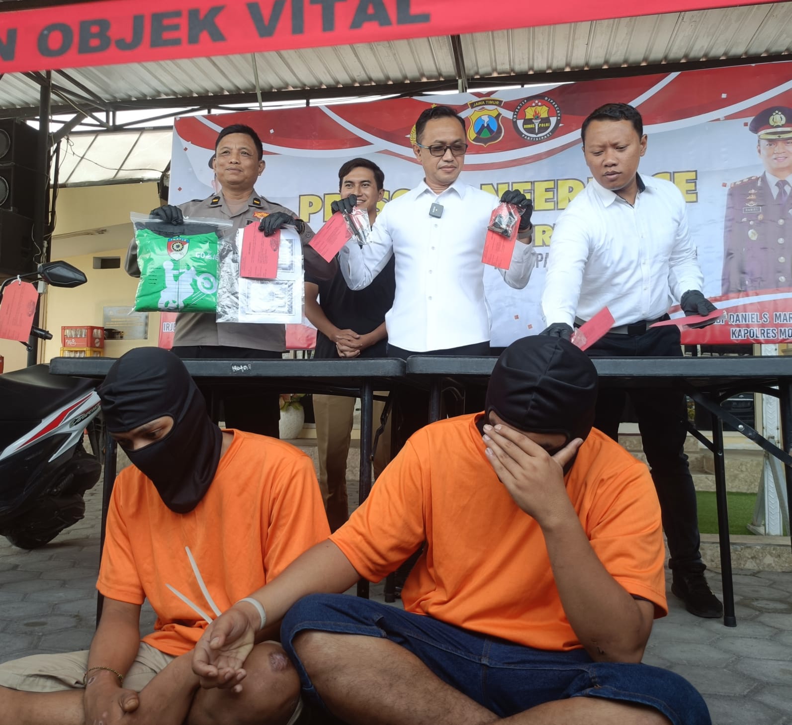 Kapolres Mojokerto Kota AKBP Daniel S. Marunduri S.I.K., M.H melalui Kasat Reskrim AKP Achmad Rudi Zaeny, S.H., didampingi Kasihumas IPDA Agung Suprihandono, dalam pers rilis menyampaikan, bahwa pada hari Selasa 9 April ada laporan pencurian kendaraan bermotor, setelah dilakukan penyelidikan dan pengumpulan data mengarah pada pelaku KM dan JS