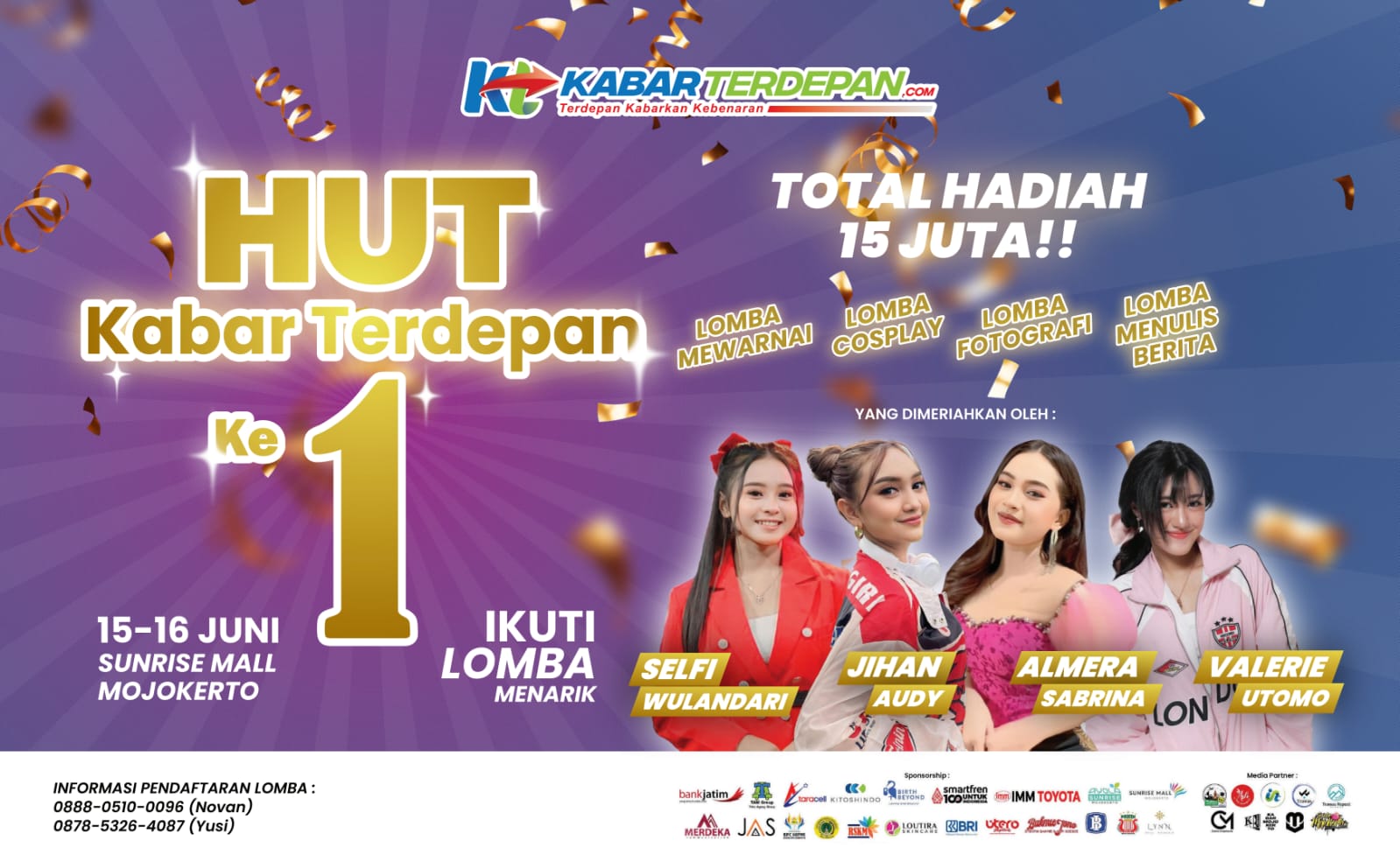 Puncak perayaan HUT Kabar Terdepan dimeriahkan oleh Valerie Utomo, Selfi Wulandari, Almera Sabrina, hingga Jihan Audy di Grand Atrium Sunrise Mall Mojokerto, Minggu (16/6/2024) mendatang.