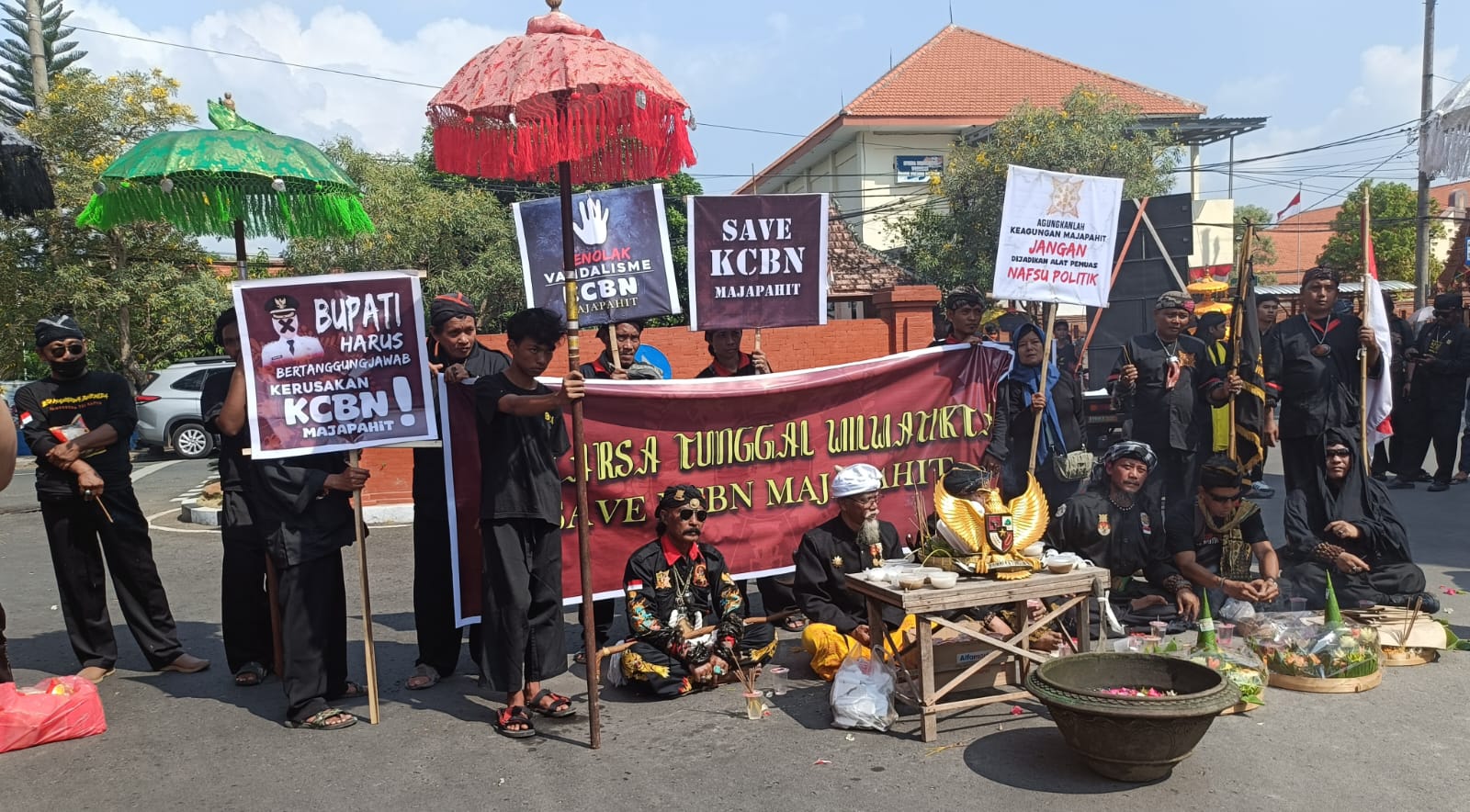 Aksi mereka diawali dari titik kumpul di depan Disbudporapar kabupaten Mojokerto Jl. Jayanegara No.4, Mergelo, Meri, Kec. Magersari, Kota Mojokerto, dengan mengendarai motor dan mobil para budayawan kabupaten Mojokerto bergerak menuju kantor pemkab Mojokerto dengan pengawalan aparat kepolisian.