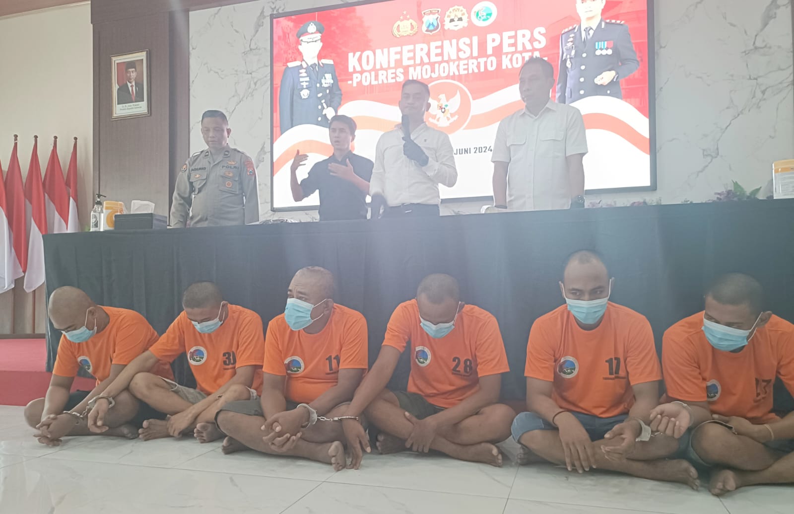Dan berhasil meringkus 6 tersangka, masing-masing ODC (28) warga Kec.Tulangan, Kab Sidoarjo, SA (28) warga Kec.Ngoro, Kab. Mojokerto, Yl (47) residivis warga Kec. Mojoanyar, Kab. Mojokerto, RD (37) residivis, warga Kec. Pungging, Kab. Mojokerto, NA (30) residivis, warga Kec. Jetis, Kab. Mojokerto dan AK (25) Warga Kec.Pungging, Kab. Mojokerto.