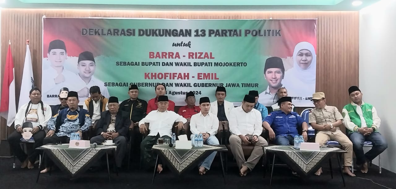 MOJOKERTO, JURNALDETIK.COM – Sebanyak 13 Partai Politik (Parpol) Deklarasi dukungan untuk pasangan Bacalon bupati dan wakil bupati Mojokerto 2025-2030 Muhammad Al Barra dan Muhammad Rizal Octavian (MUBAROK) di Pilkada kabupaten Mojokerto 2024.