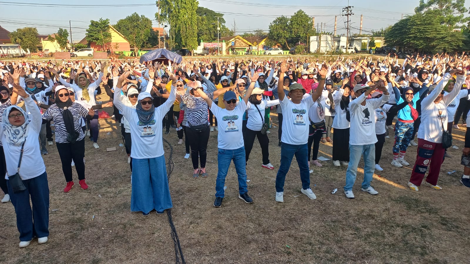 Sambil mengacungkan 2 jari, para peserta senam sangat gemulai setiap gerakan senam. Jingle Lagu wis wayahe bupatine Gus Barra, mengiringi gerakan senam Mubarok.
