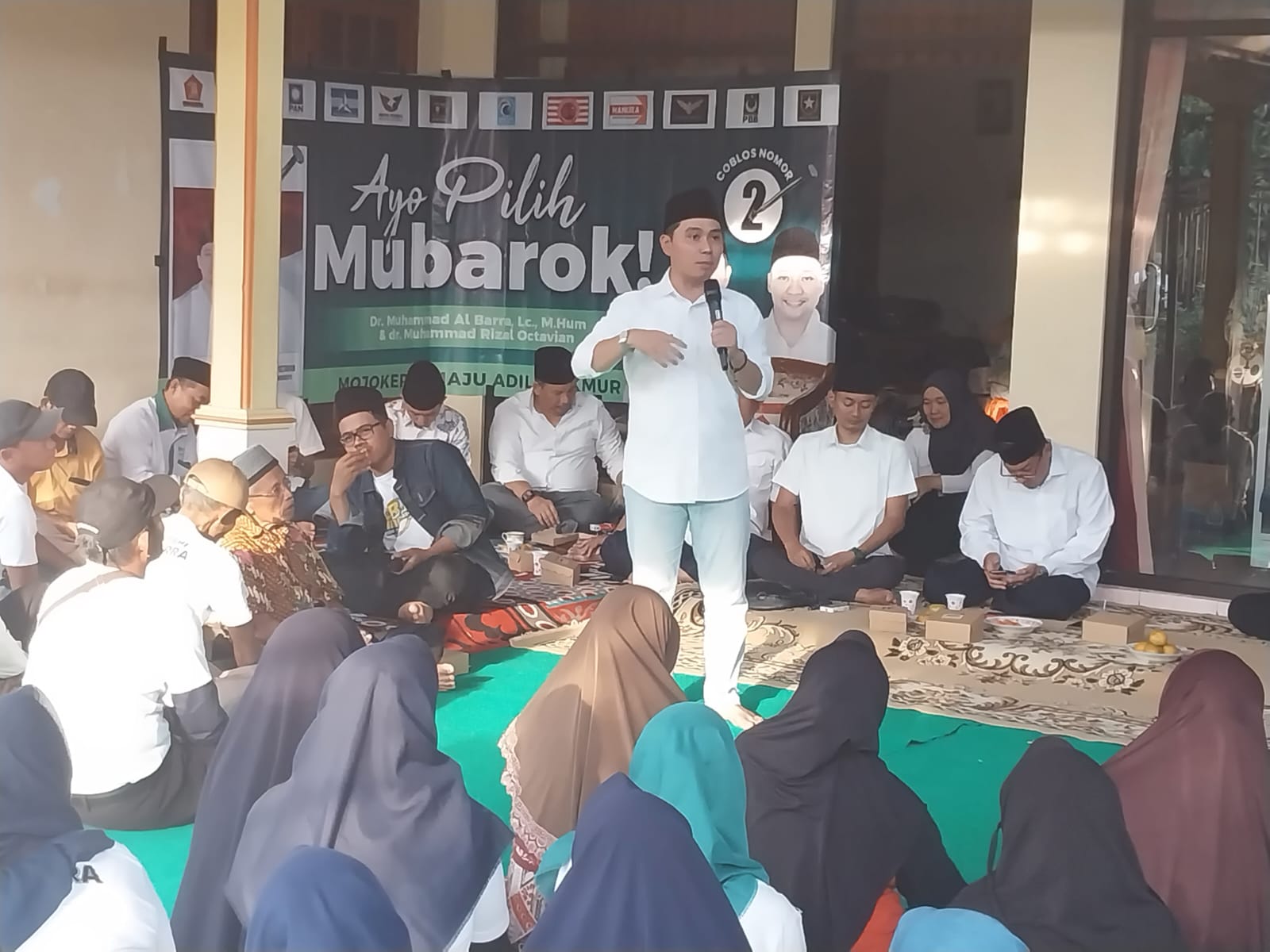MOJOKERTO,JURNALDETIK.COM- Pasangan Nomor urut 02 calon bupati dan wakil bupati Mojokerto Dr Muhammad Al Barra dan dr Muhammad Rizal Octavian (MUBAROK) mengelar kampanye tatap muka dengan warga kecamatan Gedeg, Mojokerto. Pada Kamis (17/10/2024)