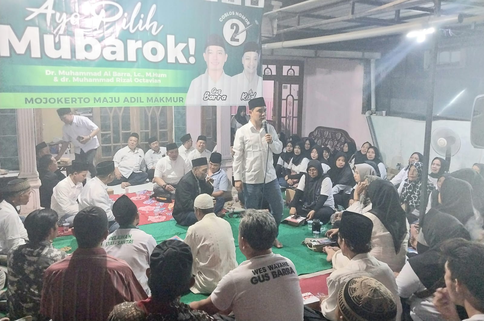 MOJOKERTO,JURNALDETIK.COM- Calon Bupati Mojokerto, Dr Muhammad Al Barra, Lc, M.Hum, memanfaatkan momentum kampanye tatap muka di Dusun Losari, Desa Sidoharjo, Kecamatan Gedeg, Kabupaten Mojokerto pada Jumat, 18 Oktober 2024, untuk memaparkan Program-programnya