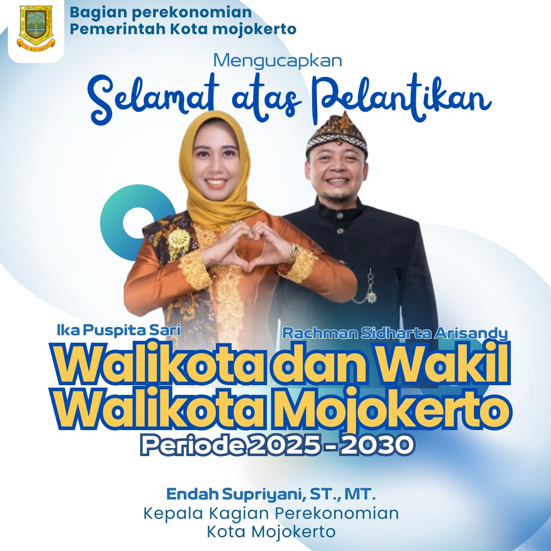Bagian Perekonomian Setda Kota Mojokerto Mengucapkan Selamat atas Dilantiknya Ning Ita dan Cak Sandi Sebagai Walikota dan Wakil Walikota Mojokerto Periode 2025-2030 pada 20 Februari 2025 oleh Presiden RI Prabowo Subianto
