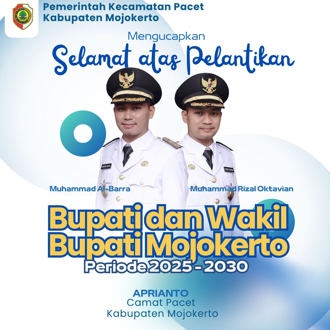 Camat Pacet Mengucapkan Selamat atas Dilantiknya Dr Muhammad Al Barra Lc M.Hum dan dr Muhammad Rizal Octavian sebagai Bupati dan Wakil Bupati Mojokerto Periode 2025-2030