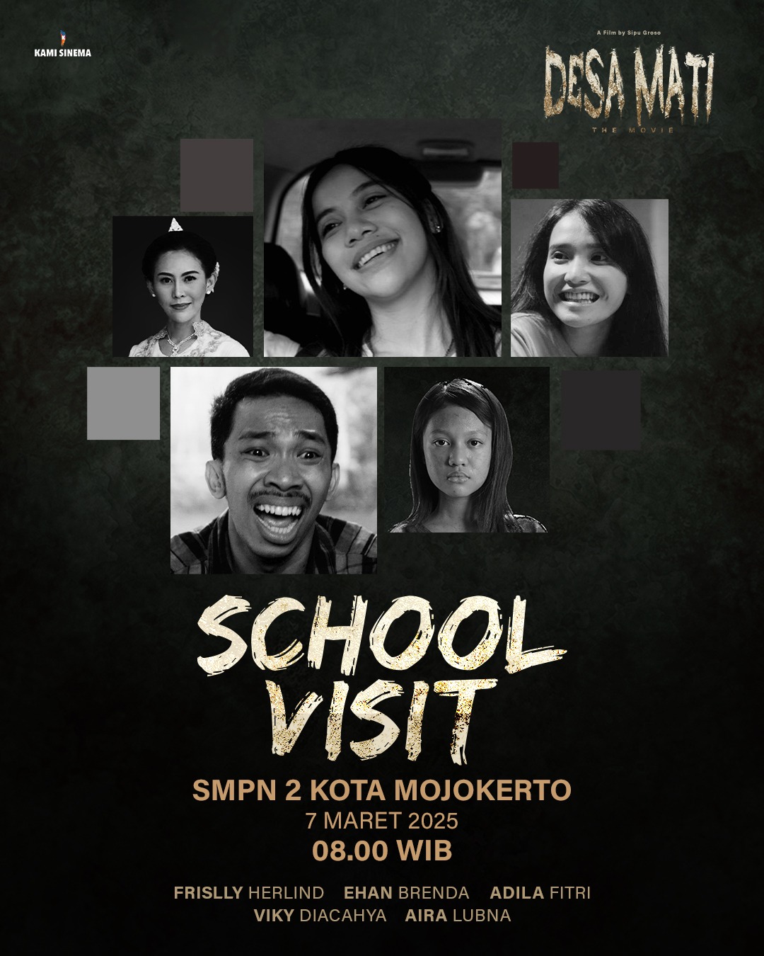 Film Desa Mati, yang dibintangi Aira Lubna, yang telah tayang serentak di seluruh Indonesia pada tanggal 6 Maret 2025 . Film ini mengusung kisah mencekam tentang sebuah desa misterius yang menyimpan banyak rahasia. Dengan kunjungan Aira ke sekolah, diharapkan semakin banyak penonton yang tertarik menyaksikan film tersebut.(Kar)