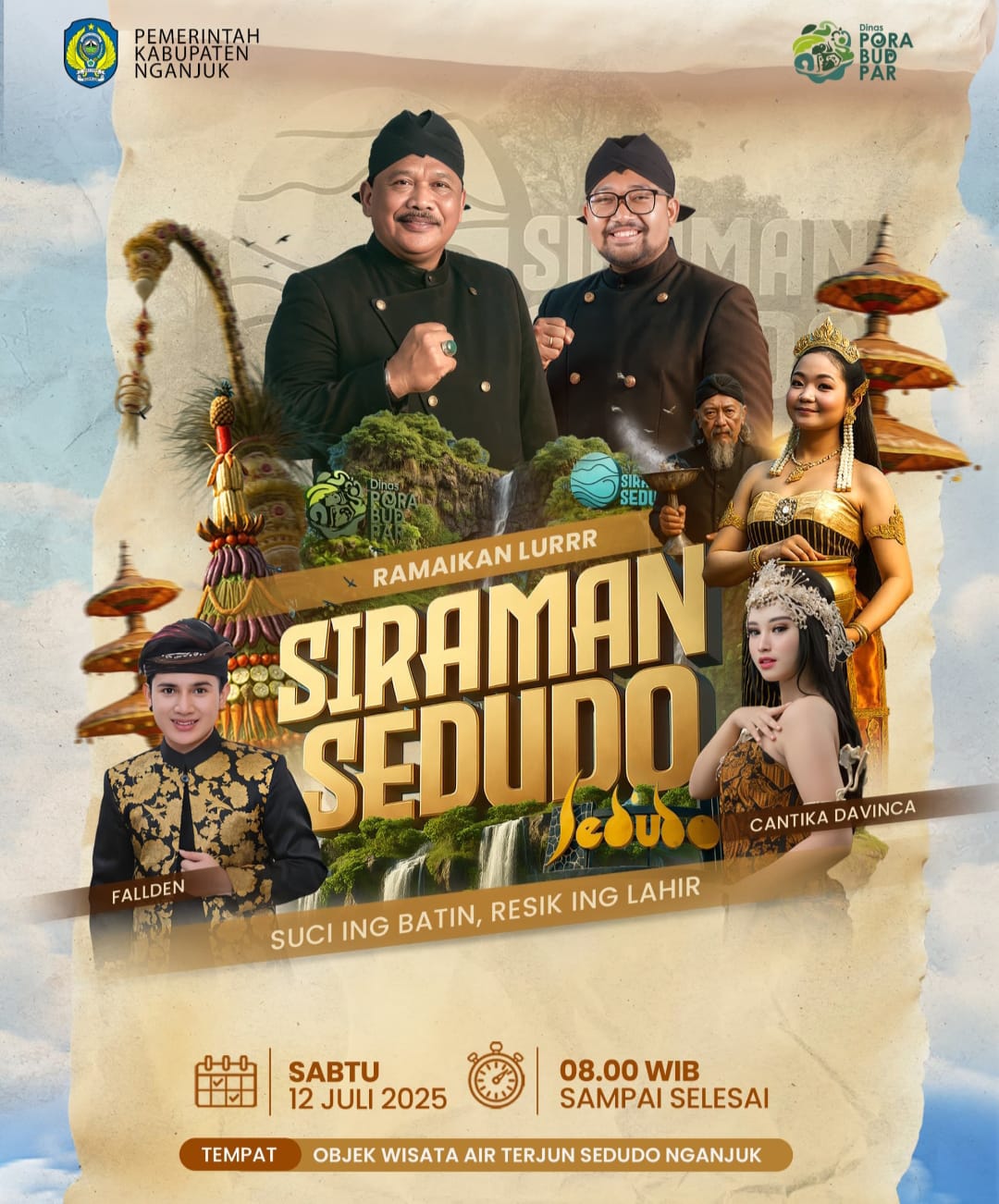 NGANJUK, JURNALDETIK.COM – Pemerintah Kabupaten Nganjuk kembali menggelar tradisi budaya dan spiritual tahunan bertajuk “Siraman Sedudo”, yang akan dilaksanakan pada Sabtu, 12 Juli 2025 mulai pukul 08.00 WIB hingga selesai, bertempat di Objek Wisata Air Terjun Sedudo, Nganjuk.