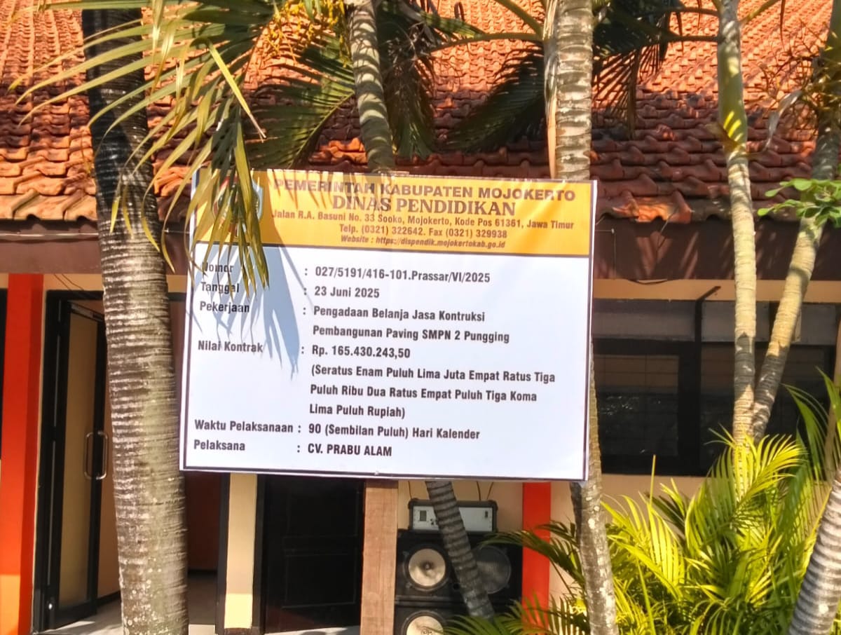 Melalui paket pekerjaan Pengadaan Belanja Jasa Konstruksi Pembangunan Paving SMPN 2 Pungging, proyek tersebut resmi dimulai dengan nilai kontrak sebesar Rp165.430.243,50 (seratus enam puluh lima juta empat ratus tiga puluh ribu dua ratus empat puluh tiga rupiah lima puluh sen).