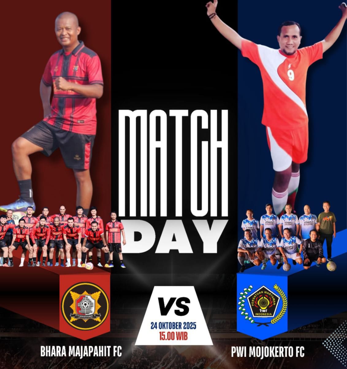 MOJOKERTO, JURNALDETIK.COM – Laga persahabatan bertajuk Match Day Futsal akan mempertemukan Tim PWI Mojokerto FC melawan Tim Bhara Majapahit FC pada Jumat (24/10/2025) di lapangan AKA Benpas Futsal, Kota Mojokerto. Pertandingan ini digelar sebagai ajang mempererat sinergitas antara Polri dan insan pers di wilayah Mojokerto Raya.