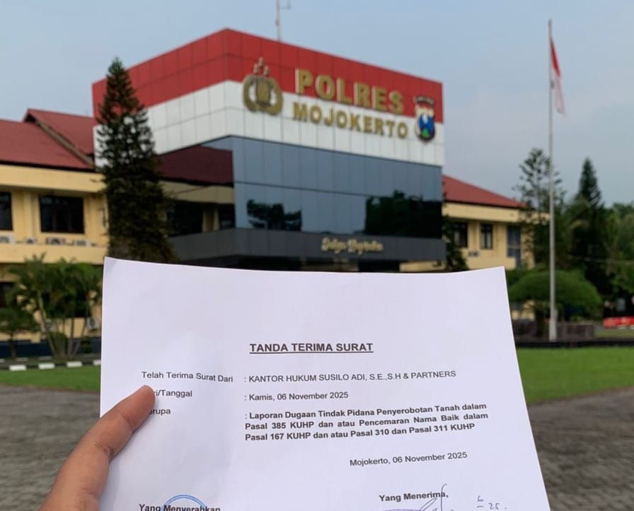 MOJOKERTO, JURNAL DETIK.COM — Dugaan tindak pidana penyerobotan tanah terjadi di wilayah Desa Dinoyo, Kecamatan Jatirejo, Kabupaten Mojokerto. Kuasa hukum pelapor, Susilo Adi Siswo Kuncoro, S.E., S.H., dari Kantor Hukum Susiloadi, S.E., S.H & Partners, secara resmi melayangkan laporan ke Polres Mojokerto pada Kamis, 6 November 2025.