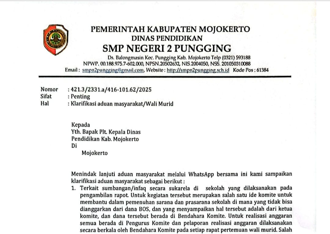 MOJOKERTO,JURNALDETIK.COM-Menyikapi adanya aduan masyarakat yang masuk melalui pesan WhatsApp terkait dugaan pungutan di SMPN 2 Pungging, Kepala Sekolah M. Salam Yusuf, S.Pd., M.Pd., memberikan klarifikasi resmi kepada Plt. Kepala Dinas Pendidikan Kabupaten Mojokerto. Klarifikasi tersebut disampaikan melalui surat bernomor 421.3/2331.a/416-101.62/2025 yang ditandai sebagai surat penting.