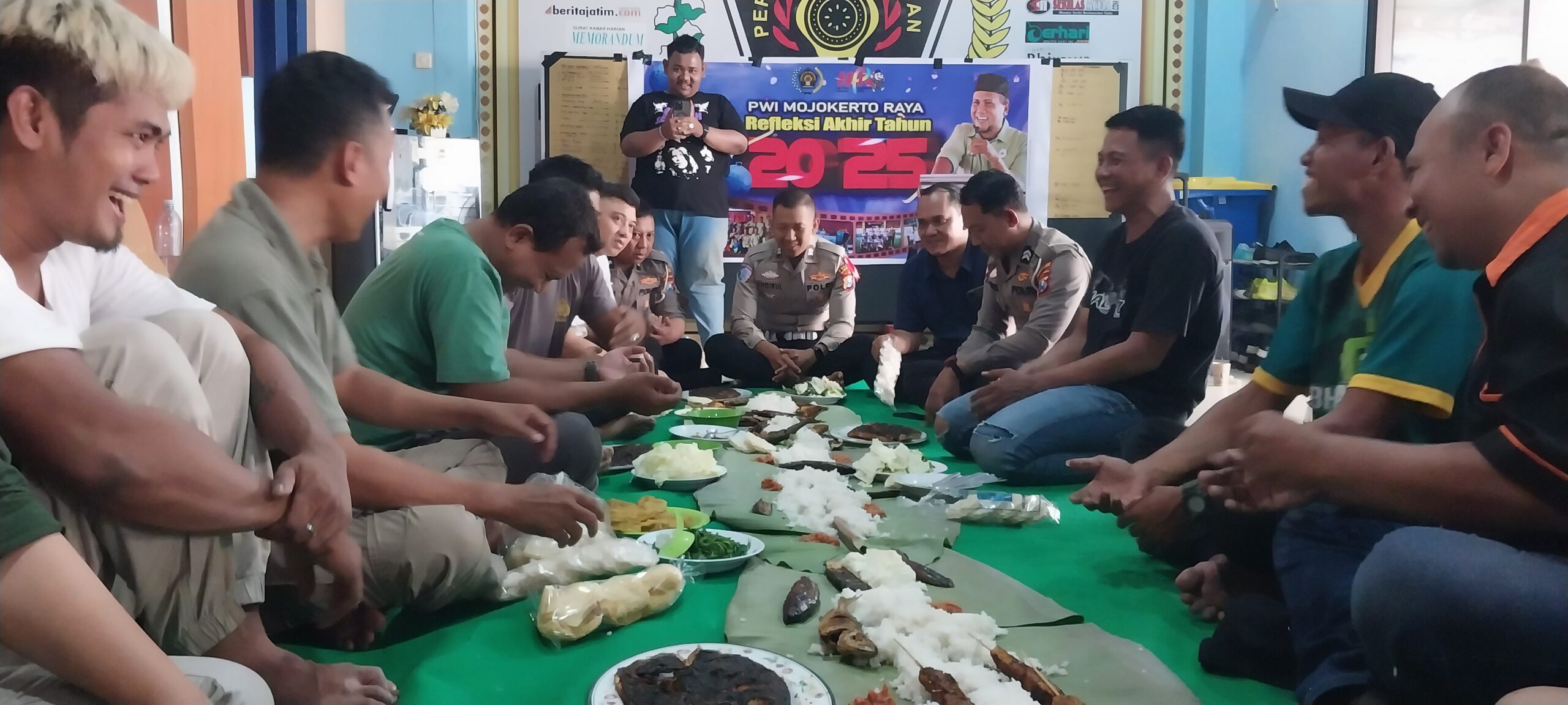 Suasana keakraban semakin terasa saat jajaran Satlantas Polres Mojokerto Kota dan anggota PWI Mojokerto Raya makan bersama hidangan ikan bakar yang disajikan di atas daun pisang, hasil olahan anggota PWI sendiri. Kebersamaan tersebut menjadi simbol eratnya hubungan antara kepolisian dan insan pers di Mojokerto Raya.